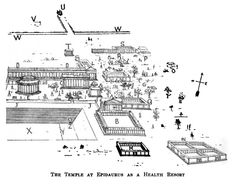 The Temple at Epidaurus as a Health ResortThis gives some slight idea of the magnificent arrangement of this famous health resort of the Greeks in which every possible care was taken to influence the mind of the patient favorably and bring about his cure. The buildings of the Hieron or medical institution of Epidaurus were beautifully situated about six miles from the town of Epidaurus in picturesque scenery and the most healthful surroundings. There were a series of bathing houses for hydropathy. The abatons, lofty and airy sleeping chambers with their southern sides and open colonnade, are singularly like the open balconies of our tuberculosis sanatoria. Every occupation of mind was provided. There was a theatre that would seat over 10,000 people. Here the great classic Greek plays were given with fullest effect. There was a stadium seating about 12,000 people in which athletic events were witnessed, finally there was a hippodrome for alt sorts of amusements in which animals shared. Then there were the walks through the country, sheltered paths around the grounds for inclement weather, even tunnels for passage from one building to another and all the influence of religion, of suggestion, of contact with cultured priests thoroughly accustomed to dealing with all manner of patients. No wonder the place was popular and many cures effected.