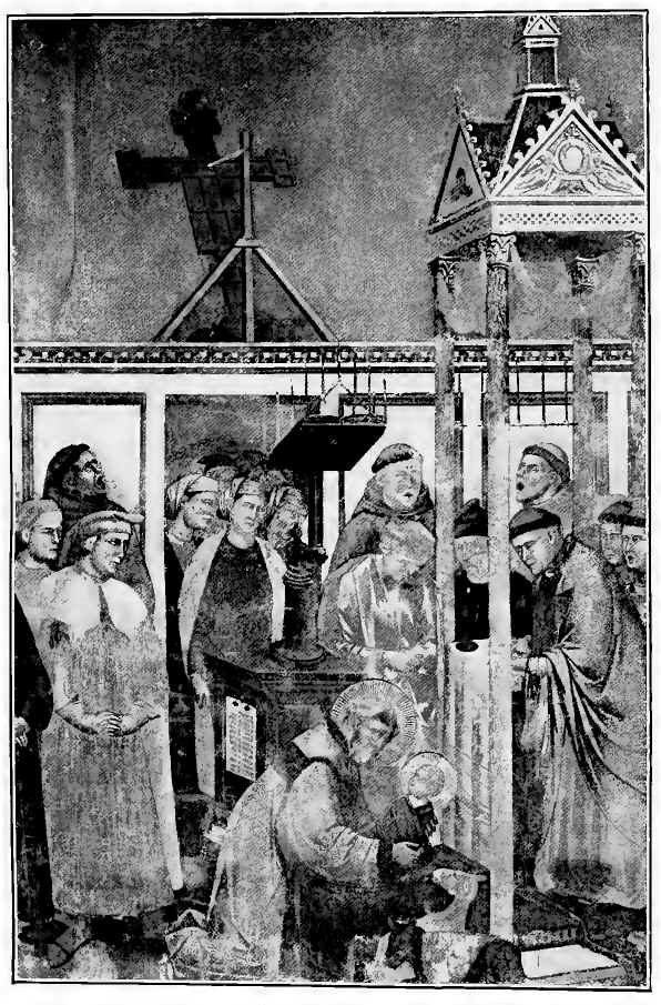 It should not be such a surprise as it might otherwise be, then, to find that St. Francis may be considered in one sense as the father of the modern drama. The story is a very pretty one and has an additional value because it has been illustrated by no less a brush than that of Giotto. One Christmas Eve just at the beginning of the Thirteenth Century, St. Francis gathered round him some of the poor people living outside of the town of Assisi, in order to recall vividly to them the great event which had taken place on that night so many centuries before. A little figure of a child, dressed in swaddling clothes, was laid on some straw in a manger with the breath of the nearby animals to warm it. To this manger throne of the Child King of Bethlehem, there came in adoration, after the hymns that recalled the angels' visit, first some of the shepherds from the surrounding country and then some of the country people who represented the kings from the East with their retinues, bringing with them their royal gifts. After this little scene, probably one of the first Nativity plays that had ever been given, St. Francis, according to the old legend, took the little image in his arms and in an excess of devotion pressed it to his heart. According to the old-time story, the infant came to life in his embrace and putting its little arms around his neck embraced him in return. Of course our modern generation is entirely too devoted to "common sense" to accept any such pretty, pious story as this as more than a beautiful poetic legend. The legend has provided a subject for poet and painter many a time in subsequent centuries. Perhaps never has it been used with better effect than by Giotto, whose representation is one of the favorite pictures on the wall of the upper church of Assisi. Whether the little baby figure of the play actually came to life in his arms or not we do not know, but one thing is certain, that infant modern dramatic literature did come to life at the moment and that before the end of the Thirteenth Century it was to have a vigor and an influence that made it one of the great factors in the social life of the period. The Franciscans were soon spread over the world. With filial reverence they took with them all the customs of their loved Father of Assisi, and especially such as appealed to the masses and brought home to them in a vivid way the great truths of religion. By the middle of the century many of the towns had cycles of mystery plays given at various times during the year, associated with the different feasts and illustrating and enforcing the lessons of the liturgy for the people in a manner so effective that it has probably never been equaled before or since.