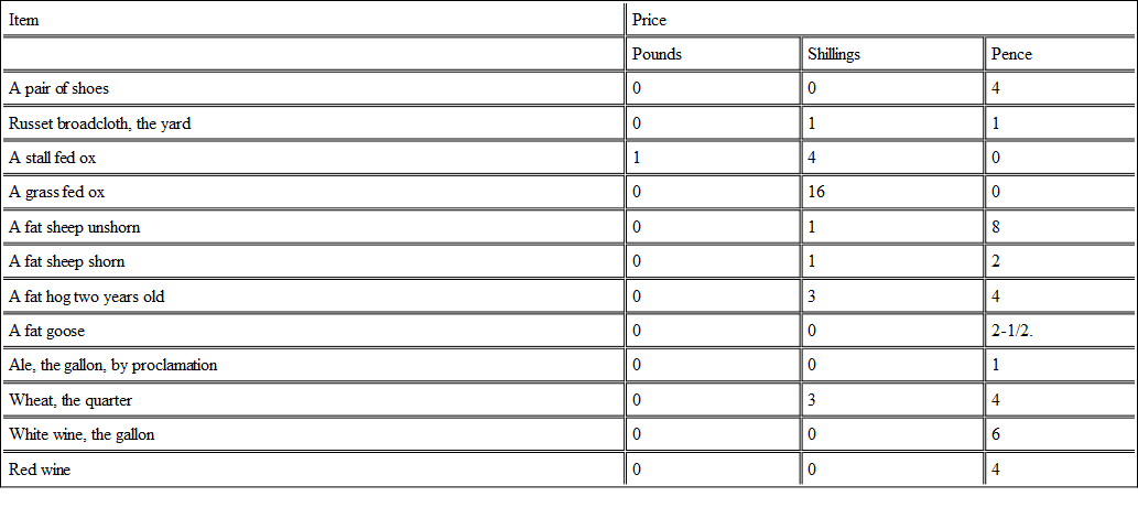 It is easy to understand that beef, pork, mutton, veal and even poultry were the food of the poor, when a workman could earn the price of a sheep in less than four days or buy nearly two fat geese for his day's wages. A day laborer will work from forty to fifty days now to earn the price of an ox on the hoof, and it was about the same at the close of the Thirteenth Century. When a fat hog costs less than a dollar, a man's wages, at eight cents a day, are not too low. When a gallon of good ale can be obtained for two cents, no workman is likely to go dry. When a gallon of red wine can be obtained for a day's wages, it is hard to see any difference between a workman of the olden time and the present in this regard. Two yards of cloth made a coat for a gentleman and cost only a little over two shillings. The making of it brought the price of it up to two shilling and six pence. These prices are taken from the Preciosum of Bishop Fleetwood, who took them from the accounts kept by the bursars of convents. Fleetwood's book is accepted very generally as an excellent authority in the history of economics.