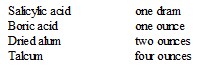 A little of the powder should be shaken into the stockings every morning, and the stockings should be changed very frequently, once or twice a day. This powder is also efficient against perspiration and bad odor from the armpits.