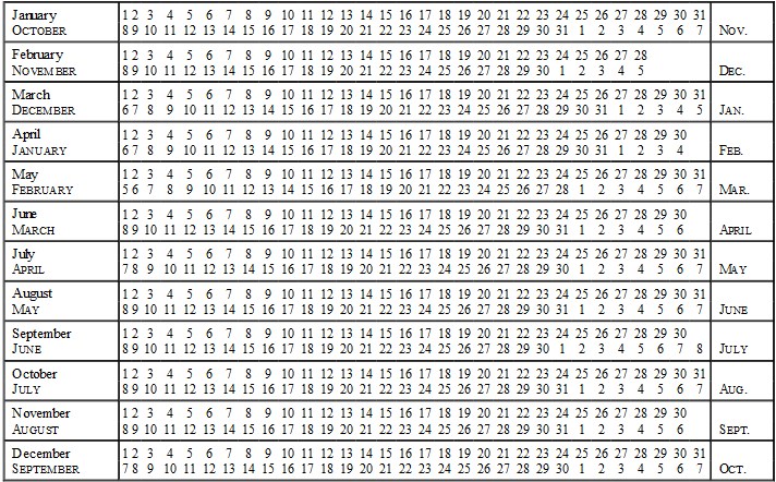 Explanation.—Find in top line the date of menstruation, the figure below will indicate the date when confinement may be expected, i.e., if date of menstruation is June 1st, confinement may be expected on March 8th, or one day earlier if leap year.