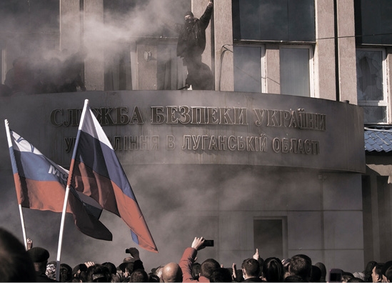 6 апреля колонна десантников в полторы сотни человек во главе с Сергеем Сиваком (позывной Югослав) подошла к зданию луганской СБУ. За несколько часов на площади собралась многотысячная толпа. Лидеры протеста потребовали освобождения задержанных накануне товарищей. Карякина, Рельке и других подпольщиков выпустили. После этого начался штурм здания. Его защищало несколько сотен милиционеров с щитами и дубинками. В конце концов, повстанцы смяли милицейские ряды, проникли в «избушку»[14] и взяли её под полный контроль, вывесив флаг России. Десантники вскрыли оружейную комнату и разжились большим количеством оружия и боеприпасов. На следующий день перед зданием возвели баррикады и разбили палаточный городок.