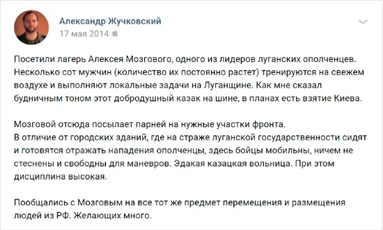 Пост Алексея Мозгового на личной странице в «Одноклассниках» 13 марта 2014. (ok.ru/profile/551539700856) Во время восстания и летнего периода войны Мозговой оставлял записи только на ok.ru, а в начале сентября открыл страницу ВКонтакте.