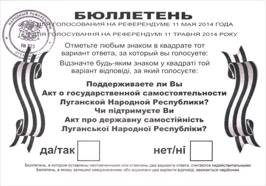 11 мая состоялся референдум. На голосование был вынесен всего один вопрос: «Поддерживаете ли Вы акт государственной самостоятельности Луганской Народной Республики?». По данным организаторов референдума, явка составила 75 % жителей Луганщины. Из них за независимость республики проголосовало 96 %. На следующий день был провозглашён государственный суверенитет ЛНР. В Донецке 11 мая также прошёл референдум о независимости, и 12 числа был провозглашён государственный суверенитет Донецкой Народной Республики.