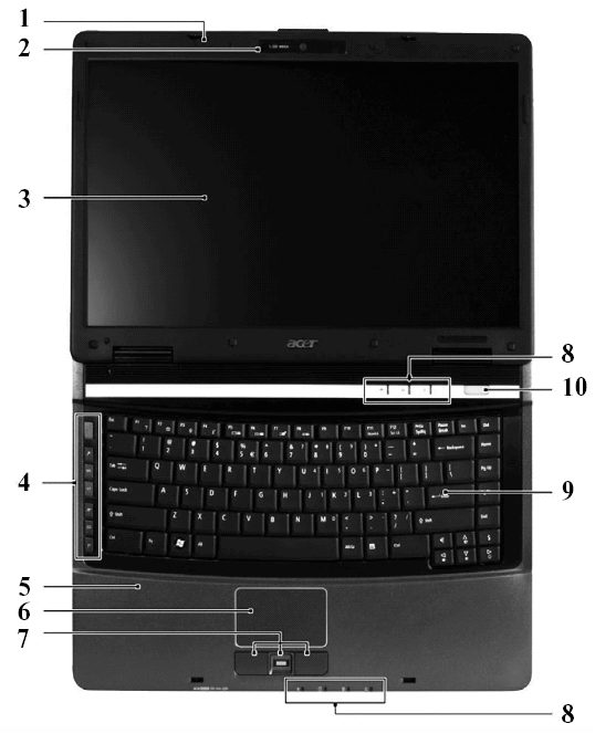 10. Кнопка питания (с ее помощью мы будем включать ноутбук).