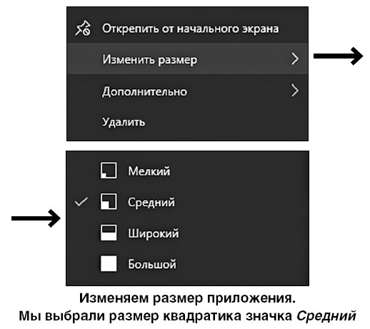 Чтобы убрать квадратик с приложением или изменить его размер приложения в разделе Пуск: