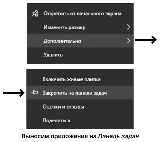 Повторяем пункты 1 и 2, а затем выбираем действие Дополнительно и далее – Закрепить на панели задач. Иконка (маленькая картиночка) приложения появится на полосочке внизу, когда вы откроете Рабочий стол.