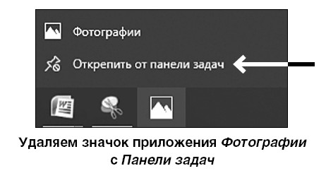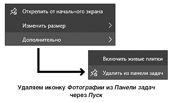 2. Нажмите правой клавишей мыши на квадратик Фотографии и выберите: Дополнительно – Удалить из панели задач.