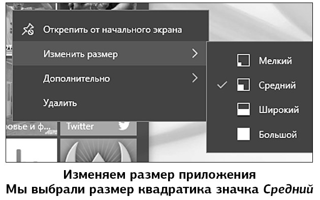 Чтобы убрать квадратик с приложением или изменить размер приложения в разделе Пуск: