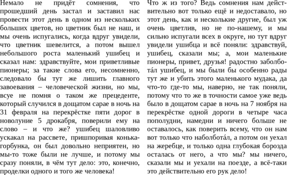 Всякое упоминание о геройстве и ненадёжности долгого лунного рассвета мысленно отрицалось, и тем не менее не было ясно, что ранний рассвет возможен и настоятелен: хотя бы в некоторых местах уже упали на росистую землю луковичные всходы долгой зари, хотя ветер был долгий и непостоянный, и тёплая ночь вселяла уверенность в конечность такого мироустройства. Пять миллиардов лет, в течение которых существовала такая система, сам факт этих пяти миллиардов как таковых, а не какой-либо другой факт либо что-то ещё – тоже не побуждал не быть уверенным в этом. Солнечная система – а речь здесь идёт именно о ней, а не о чём-либо другом – вообще очень быстро видоизменялась, производя пар, сумерки и галлюциногенные осадки.