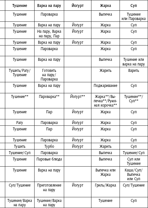 Таблица 2. Совмещение режимов разных моделей мультиварок