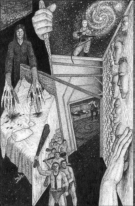 Навстречу попадается Тирбиш, из носа у него висит змея. Протягиваю руку, щупаю его: нет, глюк. Идём дальше. Одна из кают открыта, освещена. Там сидят Дюпониха с Квиггли и обсуждают безопасность. Куски обгорелой плоти болтаются при движениях. Чего теперь-то обсуждать, думаю.