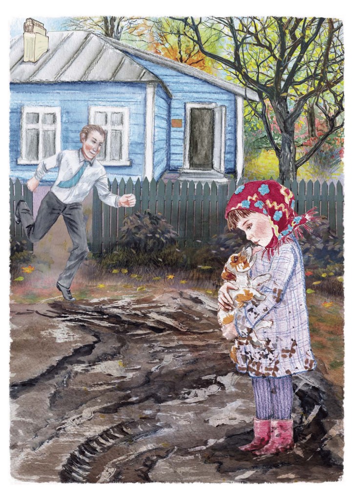 Поблизости никого не было, поэтому девочке надо было самой принять какое-то решение – и очень быстро, ведь по дороге в любой момент мог проехать лесовоз. Маруся, преодолев страх, бросилась вызволять щенка. Она решительно подошла к бедолаге, вытащила его из глиняной жижи и прижала к себе. Но тут неожиданно поняла, что её новые резиновые сапожки, которые были ей великоваты, тоже застряли. Когда она вытаскивала одну ножку, то сапожок оставался в дорожной грязи. Марусе приходилось возвращать ножку обратно. Девочка попробовала вытащить другую ножку, но глина не хотела отпускать и этот сапожок. Устав от попыток выбраться, Маруся, может быть, в первый раз в своей маленькой жизни ощутила отчаяние. На улице не было никого, кто бы мог ей помочь. Щенок беспрестанно лизал ей лицо в знак благодарности, и Маруся как могла уворачивалась от него.