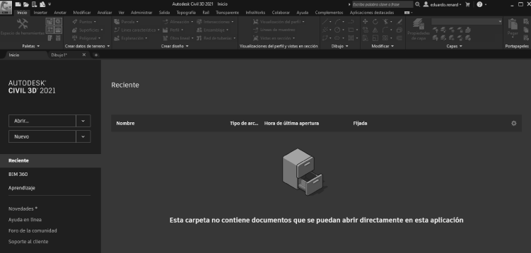1. Inicie Autodesk Civil 3D y haga clic en la pestaña Inicio. Esto activará una pantalla de acceso rápido a ficheros.