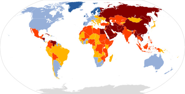 Бугун айнан дунёнинг ахборий харитаси дейилмаса-да, унинг компонентларини ўзида жамловчи бир қатор хариталар, индекслар яратилган, юритиб борилмоқда. Масалан, сўз эркинлиги индекси (1.1-расмга қаранг), ахборотнинг ижобий кўрсаткичи (индекси) – компания, бренд ёки шахс ёки бирор воқеа-ҳодиса ҳақидаги ахборий вазиятни баҳолаш кўрсаткичи, интернет тезлиги рейтинги17 ва ҳоказо.