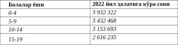 2021 йил ҳолатига кўра, Ўзбекистонда 10 ёшгача бўлган 7,5 миллиондан ортиқ бола яшайди36. 6-жадвалда эса 2022 йилдаги аҳолининг ёш таркибига кўра тақсимланиши37да болаларнинг сони қуйидагича.