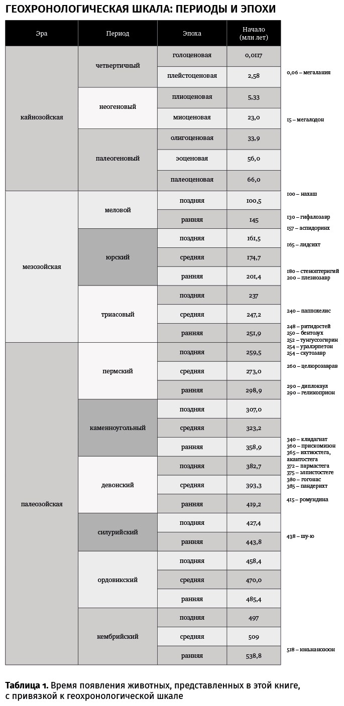 Вот о таких удивительных и необычных, пусть и не совсем уж редких находках, позволяющих представить, какими вымершие животные были при жизни, и пойдет речь в этой книге. Итак, перед вами 27 ярких портретов, подобранных так, чтобы показать в общих чертах эволюцию позвоночных животных: от мелких организмов, похожих скорее на червячков и плававших в морях почти 520 млн лет назад, до гигантских ящериц, чьи шаги сотрясали почву немногим более 40 000 лет назад, и мегаакул, наводивших ужас на все живое, включая человека наших дней (табл. 1).