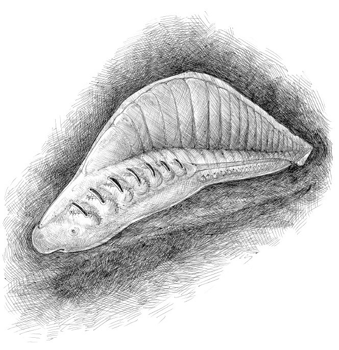 Учитывая «разночтения», более достойным кандидатом в предки всех хордовых стала представляться открытая еще в начале прошлого века пикайя (Pikaia gracilens) из не менее знаменитого среднекембрийского лагерштетта – сланца Бёрджесс, возрастом около 505 млн лет (рис. 1.2). Правда, и у нее обнаружились странные парные щупики на голове и разветвленные наружные жабры, как у каких-нибудь моллюсков…