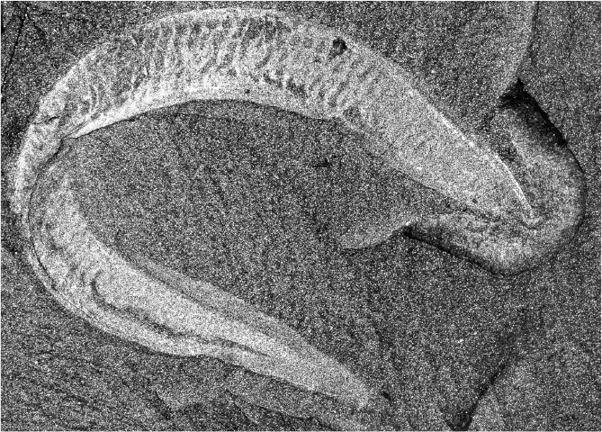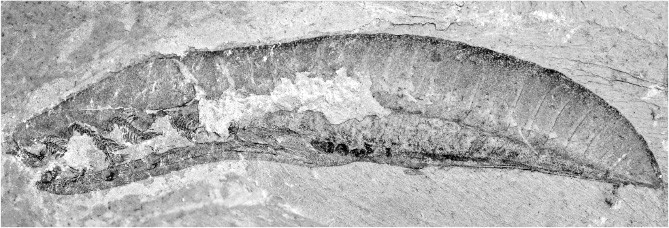 Рис. 1.2. Отпечаток пикайи (Pikaia gracilens), длина 5 см; вид сбоку: в передней части – пара щупиков (справа вверху), поперечные мускульные блоки по всему телу и хвостовая лопасть (внизу); среднекембрийская эпоха (505 млн лет); сланец Бёрджесс, пров. Британская Колумбия, Канада (Королевский музей Онтарио)