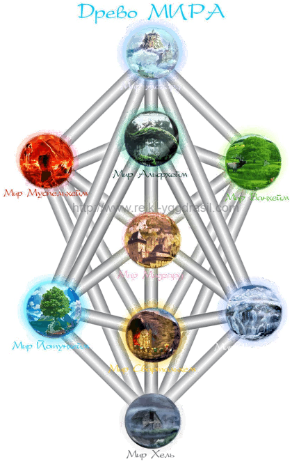 Мировое Древо Иггдрасиль – это строение сознания самой Вселенной, имеющее кристаллическую структуру. В основе Древа Иггдрасиль находится центральная ось (ствол), включающая в себя миры Хель Свартальхейм, Альфхейм и Асгард, вокруг которой формируется энергетическое пространство (корни и ветки), вмещающее в себя все многообразие миров – Муспельхейм, Нифельхейм, Мидгард, Ванхейм и Йотунхейм.