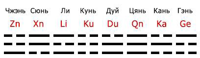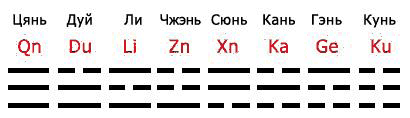 Дальше это все переходит в триграммы (ба-гуа), обозначение взаимодействия человека с миром. Есть четыре иньских и четыре янских триграммы. Каждая триграмма состоит из трех черт: