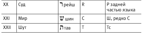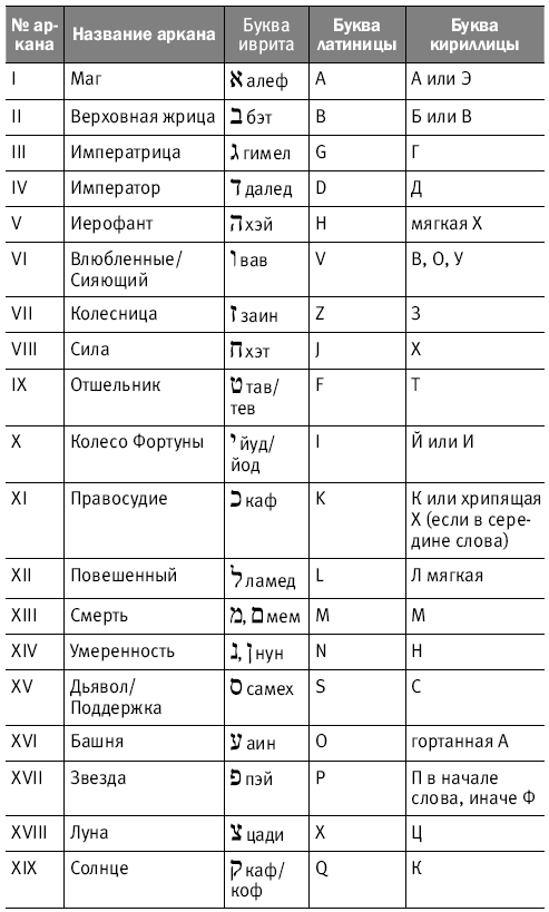 Базовые ритуалы включают достаточно большую группу буквенных ритуалов, в которых мы работаем с буквами алфавита иврита. Их соответствия арканам таро, а также буквам латинского алфавита и кириллице приведены в таблице ниже.