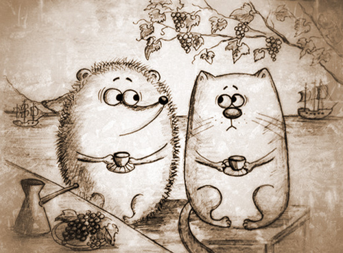 Как-то Художник и Кот вышли на веранду пить кофе и встретили Ежа. Еж сидел в кресле-качалке, закинув ногу на ногу, задумчиво курил и смотрел вдаль. Он был вполне просветлён и отрешён от мирской суеты. Ну, вернее, как просветлён. Так, читал уже много лет странную книгу о духовных практиках и говорил всем, что познал истину. Поэтому Художника с Котом он не заметил. Но выпить кофе согласился. Просветление вообще лучше всего снисходит после завтрака.