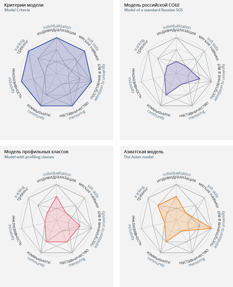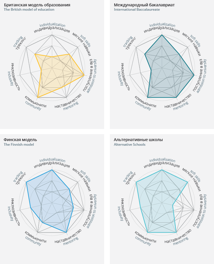 Диаграмма показывает, как модели соотносятся друг с другом в разрезе определённого набора критериев. Так, видно, что модель российской государственной СОШ отличается от азиатской в первую очередь по степени индивидуализации, с одинаковым уровнем централизации. На графике показано, что ранее выделенная пара моделей альтернативных и финских школ отличаются тоже только в одной плоскости, то есть отличаются по степени децентрализации. Заметно, что Международный бакалавриат, являясь модификацией британской модели образования, делает шаг в сторону альтернативных школ и финской модели в части децентрализации и индивидуализации.