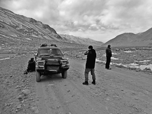 Джип родственника Пира Шо Лянгари представлял собой поистине произведение искусства. Конечно, до пакистанских «барбухаек» ему было далеко, но ведь и весовые категории разные. Цвет он имел вишневый. На верхней части лобового стекла, равно как и на обтекателях зеркал заднего вида, имелись какие-то арабские символы желтого цвета. Капот машины был затянут крупноячеистой черной сеткой, а радиатор завешен серой тканью. Кузов прикрывался черным тентом. Родственник сидел за рулем в маске. Выглядел он грозно. По дороге наш караван еще раз тормозил, и водитель производил манипуляции с зеленой пропановой горелкой, пока мы осматривали свои сектора. Через десять минут прогрева тронулись в путь, миновали людей с ишаками и одноэтажные домики, между которыми на камне, лицом строго на Кыблу, молился местный пограничник в китайском «каменном» камуфляже и с чешским АК. Проехали погранцов, выехали на мосток. Окна были открыты почти до упора, в салоне было холодно.