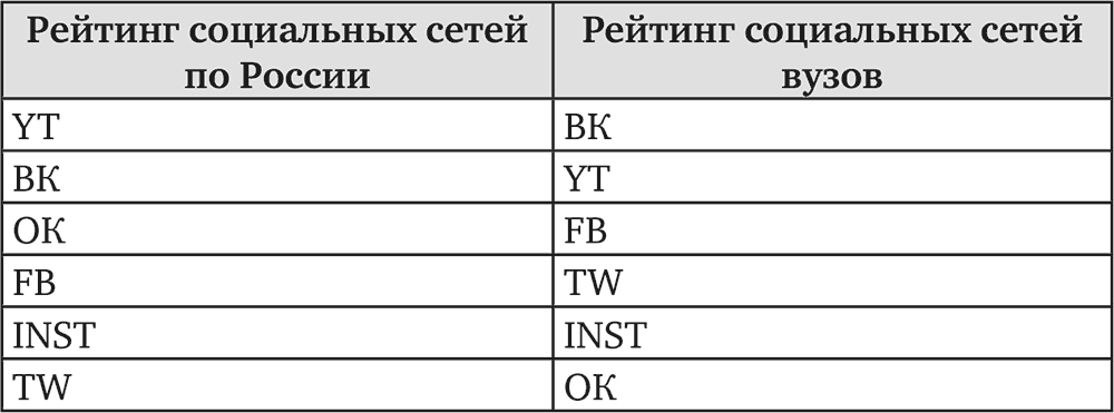 Таблица 1. Рейтинги социальных сетей по России и среди вузов