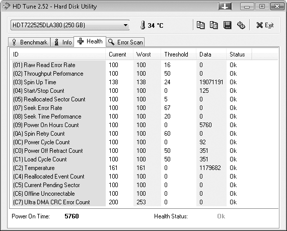 Что касается состояния жесткого диска, то информацию об этом вы можете увидеть на вкладке Health (рис. 2.17). Здесь же вы увидите вердикт программы (в нашем случае это слово Ok – то есть «не волнуйтесь, пока диск ломаться не собирается»).