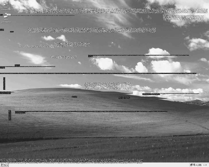 Выход из строя видеоадаптера проявляется отсутствием или искажением изображения на экране монитора. В самом наглядном случае «картинка» отсутствует с начала загрузки, монитор не включается, а программа BIOS сообщает о неисправности видеокарты звуковыми сигналами. В других ситуациях неисправность видеоадаптера может проявиться возникновением «артефактов» – цветных пятен или вырванных строк на экране (рис. 3.1).