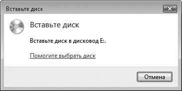 Типичным признаком загрязнения оптики или порчи лазера является то, что привод перестает читать некоторые диски, причем количество нераспознаваемых дисков увеличивается с каждым днем. Через какое-то время привод теряет способность к чтению любых дисков. При попытке открыть диск через Проводник Windows появляется сообщение с просьбой вставить диск в привод, несмотря на то что в действительности диск уже находится в приводе (рис. 3.2).
