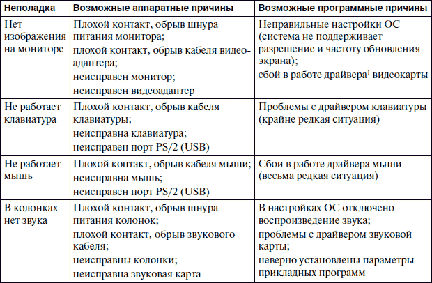 Ситуация ухудшается тем, что проявления некоторых программных и аппаратных неполадок схожи между собой, и выявление истинной причины (диагностика) – 95 % успешного исправления. На оставшиеся 5 % приходятся поиск, приобретение и установка нужных компонентов или переустановка программ.