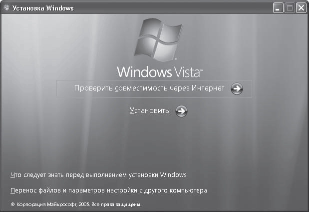 Если такой свободный раздел на диске есть, можете приступать к установке. Для этого включите компьютер, дождитесь, пока загрузится текущая версия операционной системы, и вставьте в DVD-привод установочный диск Windows Vista. Сработает программа автозапуска, и откроется окно, изображенное на рис. 1.9. Особо на нем не задерживайтесь, смело щелкайте кнопкой мыши на ссылке Установить.