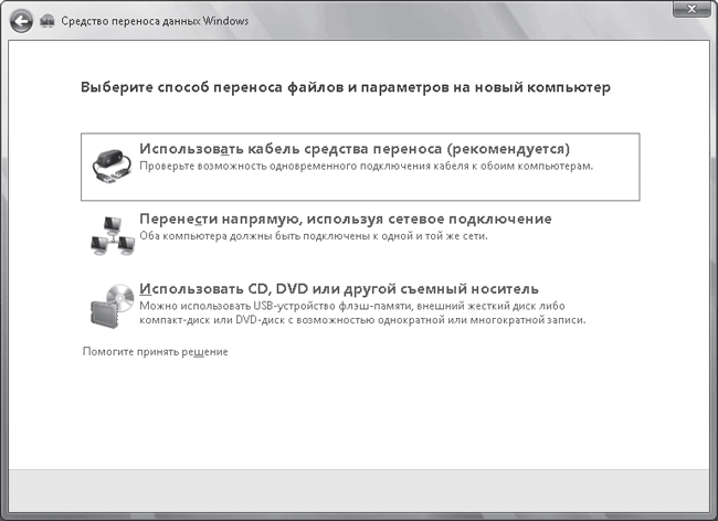 Первое окно является исключительно информационным, в нем ничего настроить нельзя, так что смело жмите кнопку Далее. В следующем окне укажите системе, что вы хотите выполнить Новый перенос, а затем щелкните кнопкой мыши на ссылке Исходный компьютер. Откроется очередное окно, в котором вам предстоит выбрать способ переноса файлов и параметров (рис. 1.11). Для примера применим последний вариант – Использовать CD, DVD или другой съемный носитель. Это значит, что данные будут скопированы на диск, а затем перенесены с него в новую операционную систему.