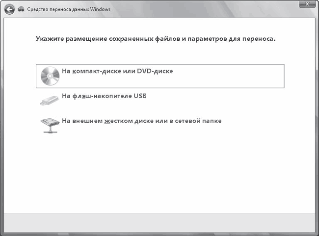 В нашем примере файлы и настройки были записаны на внешний диск, поэтому в следующем окне нужно выбрать пункт Нет, файлы и параметры скопированы на компакт-диск, DVD-диск или другой съемный носитель и далее уточнить тип носителя (рис. 1.13). Не забудьте вставить диск с сохраненными данными в привод, а то неудобно получится.