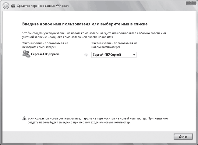 Проще, конечно, не плодить учетные записи, особенно если вы смутно представляете себе, что это такое. Поэтому лучше выбрать одну из готовых записей в списке Учетная запись пользователя на новом компьютере. Если вы все-таки хотите создать новую запись для переносимых параметров, придумайте и напишите ее имя в поле того же списка. Затем нажмите Далее.