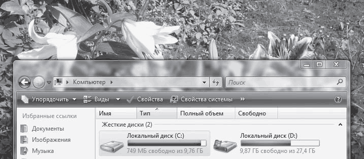 Чтобы понять лучше, что такое Windows Aero, нажмите кнопку Пуск и найдите в открывшемся меню какую-нибудь папку. Изумление, граничащее с экстазом, охватит вас, когда вы поймете, что открывшаяся папка – полупрозрачная (рис. 2.2)!