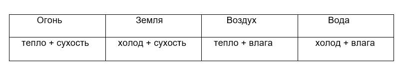 В основе стихий лежат четыре базовых принципа: тепло, сухость, холод, влага. Соединяясь попарно, они формируют четыре стихийных элемента.
