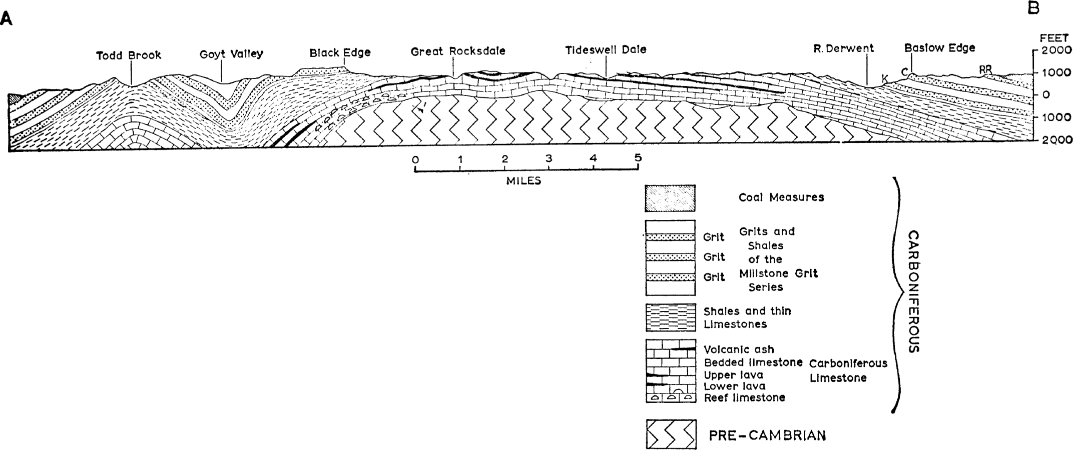 The section is drawn along the line A-B as shown on the geological map in Fig. 2 (see here). The individual grits of the Millstone Grit series, being lenticular in torm cannot be traced continuously across the area. Those outcropping in the east are indicated by inital letters as follows: K-Kinderscout Grit, C-Chatsworth Grit, RR-Rough Rock. On the west side Black Edge is formed by the Chatsworth Grit. (Prepared by Prof. W. B. R. King, Sc.D., F.R.S., based by permission on maps of the Geological Survey and other sources)