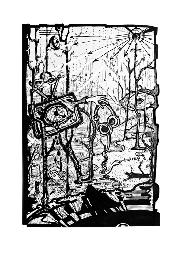 – Наверху полотна мы видим асфальт, а в нем небольшую дыру. Через нее – множество слоев мусора, символизирующих разные эпохи. Вот горшки и мотыги каменного века, а вот банки из-под пепси наших дней, – отрапортовал Костя. – Что у тебя?