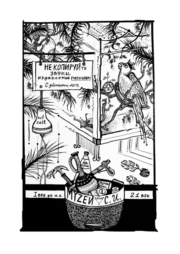 Среди пальм висела клетка с попугаем. Костя тут же скопировал его голос, а Оля саркастически указала ему на табличку, которая висела прямо у них перед носом: «НЕ КОПИРУЙТЕ ЗВУКИ, ИЗДАВАЕМЫЕ ПОПУГАЕМ», – и они оба громко рассмеялись.