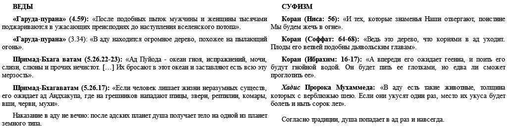 Таким образом, сравнительный анализ ведической и мусульманской картин ада показывает много общего. Однако существенное отличие заключается в том, что в традиционном Исламе ад описывается как наказание, которое наступает для всех людей одновременно после дня Страшного суда. А в ведической традиции и Страшный суд, и ад – это события, которые происходят не в определенное время, а после каждой индивидуальной жизни.