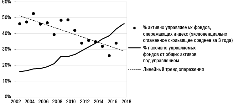 Сегодня все указывает на то, что фактически процент активных менеджеров, отстающих от индекса, со временем неуклонно увеличивался. В любом случае, даже невзирая на растущую популярность индексирования, фондовый рынок становится все более – а не менее – эффективным[9]. Подтверждение этому вы видите на представленном ниже рисунке. Сплошная кривая отображает рост доли индексирования и процента индексных взаимных фондов с течением времени. Точками обозначен процент активно управляемых фондов акций, которые не дотягивают до бенчмарка S&P 1500. Эти данные – средние показатели, взятые из отчета S&P за 2018 год, в котором доходность инвестиций под активным управлением сравнивалась с доходностью индексных фондов за трехлетний период, закончившийся в конце 2017 года. Очевидно, что доля фондов, которые превзошли широкий индекс S&P 1500, со временем снизилась, даже несмотря на увеличение доли пассивно управляемых фондов.