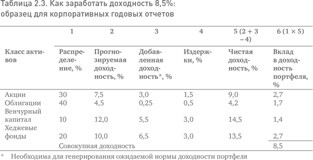 Оставим пока без внимания тот факт, что управляющие портфелями акций, способные переигрывать фондовый рынок на 3 % в год, примечательны своим отсутствием. Также оставим без внимания те риски, на которые им придется идти, чтобы добиться таких результатов. Скажем лишь то, что взятая здесь доходность венчурного капитала и доходность хеджевых фондов намного превышает даже исторические нормы, раздутые спекулятивным бумом IPO в период рыночной эйфории конца 1990-х гг. Поэтому нам также придется закрыть глаза на крайне малые шансы найти группу менеджеров «фондов абсолютной доходности», которые могли бы последовательно, на протяжении десятилетия и больше, превосходить эти нормы на 6–7 процентных пунктов в год. Разумеется, большинство инвестиционных профессионалов сочтет такие геркулесовы предположения абсурдными. Но кто знает?