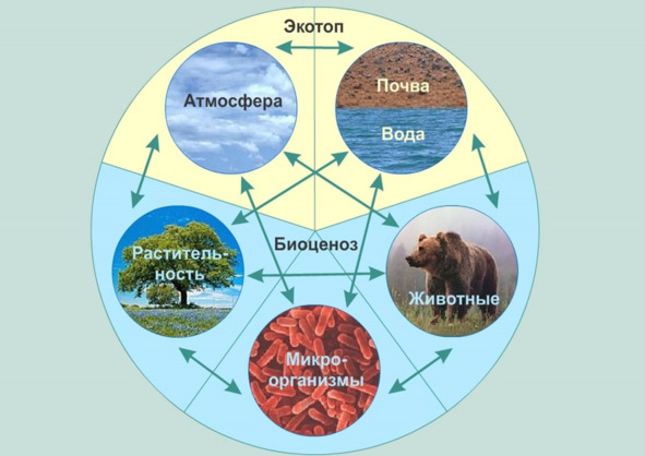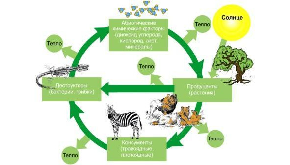 Биологической основой каждой фототрофной экосистемы является наличие трех блоков, состоящих из групп живых организмов, выполняющих различные функции – производителей ресурсов (продуцентов), потребителей ресурсов (консументов) и утилизаторов отходов (редуцентов). Главной функциональной особенностью экосистем является замкнутый круговорот вещества, включающий в себя как «живую», биотическую составляющую, так и «мёртвое», абиотическое вещество природных сред, охватываемых экосистемой. Круговорот происходит под действием потребляемой внешней энергии и регулируется деятельностью живых организмов, включённых в структуру экосистемы. В результате круговорота вещества пищевые ресурсы, необходимые для существования каждого из биологических видов, входящих в биоценоз экосистемы, становятся возобновляемыми, а отходы жизнедеятельности почти полностью утилизируются путём превращения в новые ресурсы. И так происходит бесконечное число раз, поэтому можно сказать, что в биосфере осуществляется непрерывный замкнутый «обмен веществ».