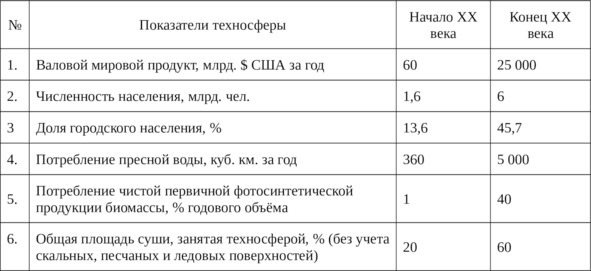 Двадцатый век стал периодом самого бурного развития техносферы, данные табл. 2.6 показывают, как возросли её основные показатели.