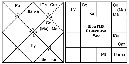 1. В гороскопе 1 управитель 9-го попадает в 8-й дом вместе с Кету. Натива, Шри П.В. Нарасимху Рао, в детстве усыновили (смена отца), что сам он контролировать никак не мог. Не было ли это предназначено судьбой, на что и указывают планеты?