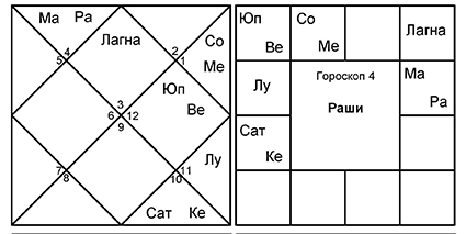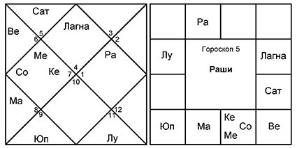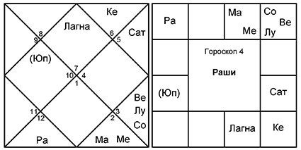 4. Гороскоп 4 очень похож на гороскоп 3, где управители 9-го и 8-го домов снова обмениваются домами. Это гороскоп индуистского брахмана, серьезно занимающегося буддийской садханой после знакомства с японским гуру.